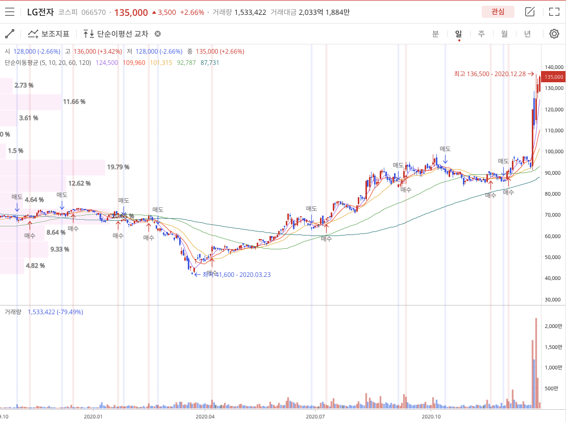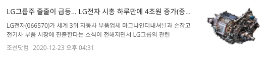 2020년 12월 23일 LG그룹주 줄줄이 급등 LG전자 시총 하루만에 4조원 증가 라는 기사제목을 볼 수 있습니다.