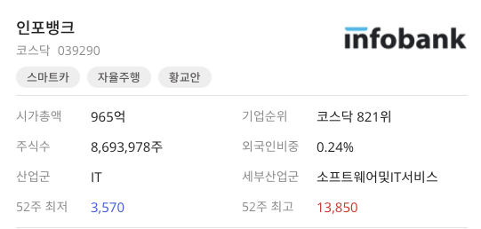 두번째 관련주는 인포뱅크 입니다. 2020년 12월 23일 애플카 수혜주 찾기 나선 투자자들 인포탱크 등 이틀 연속 상한가라는 기사를 볼 수 있습니다.