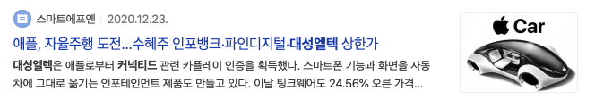 세번째 관련 종목은 대성엘텍, 파인디지털 입니다. 2020년 12월 23일 애플, 자율주행 도전... 수혜주 인포뱅크, 파인디지털, 대성엘텍 상한가 라는 기사제목을 볼 수 있고 대성엘텍은 애플로부터 커넥티드 관련 카플레이 인증을 획득했다는 기사내용도 있습니다.