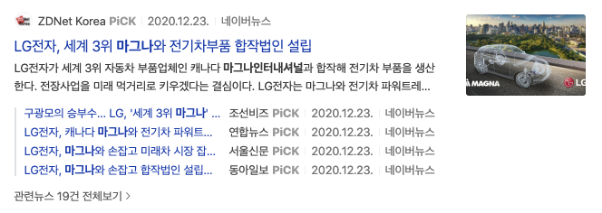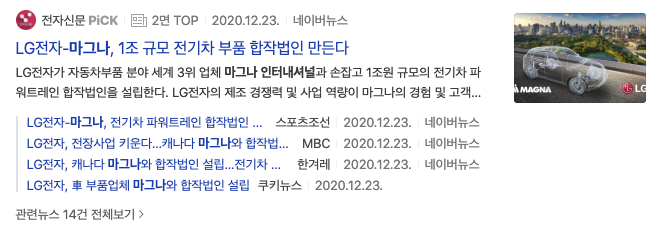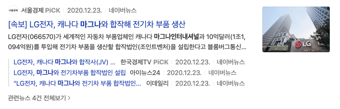 이유는 2020년 12월 29일 LG이노텍, 아이폰 넘어 애플카 부품 공급 가능성 솔솔이라는 기사제목을 봤기 때문입니다.