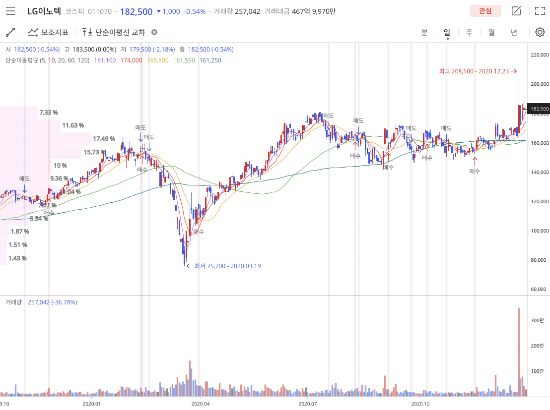 관련 내용은 LG전자가 세계 3위 자동차 부품업체 마그나인터내셔널과 손잡고 전기차 부품 시장에 진출했다는소식으로 LG이노텍도 52주 고가(208,500원)를 만들었습니다.