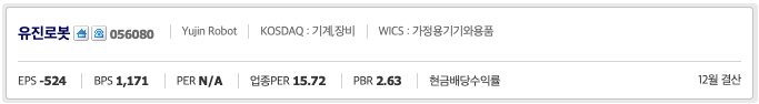 유진로봇(056080)의 세부산업군 : 내구소비재및의류 내 125개 중 업종 내 시가총액 순위 51위(1,500억)이며 PER : 91위, PBR : 106위, ROE : 103위 입니다.