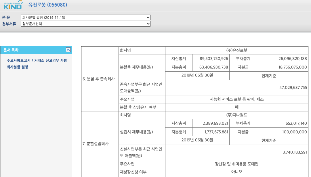 유진로봇(056080)의 최근연혁은 2020년 01일 지나월드(완구사업부) 물적분할을 한것을 볼 수 있습니다.