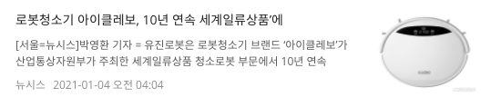 그리고 2021년 1월 4일 유진로봇(056080)의 로봇청소기 브랜드 아이클레보 10년 연속 세계일류상품 수상을 했다는 기사제목도 볼 수 있습니다.