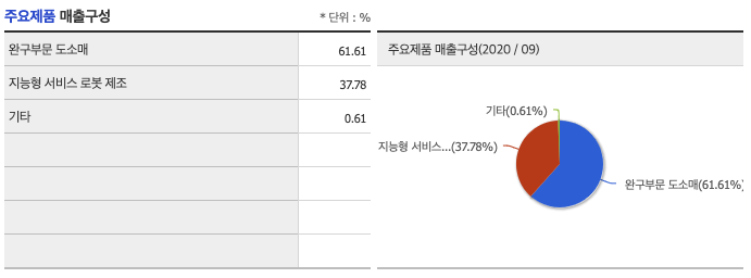 2020년 9월 전년동기 대비 연결기준 매출액은 12.9% 감소, 영업손실은 0.3% 감소, 당기순손실은 31% 증가. 동사와 밀레는 합작회사 시만(Shiman)을 설립해서 로봇 공동개발을 하고 있습니다.