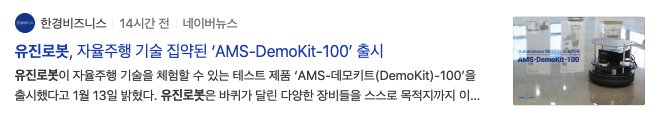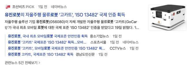 그리고 2021년 1월 19일 유진로봇의 자율주행 물류로봇 '고카트', 'ISO 13482' 국제 인증 획득이라는 기사제목을 볼 수 있는데 위에서 자율주행관련 로봇 부분의 제품군 관련 뉴스라고 생각을 할 수 있습니다.