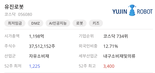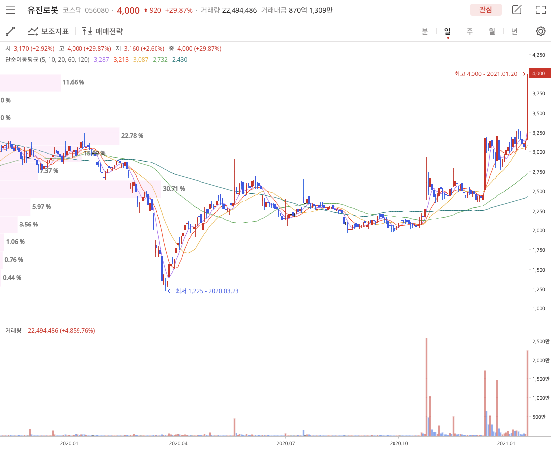 유진로봇(056080)은 2020년 3월 23일 COVID-19 52주 저점 1,225원을 찍고 52주 고점 2021년 1월 20일 4,000원에 장을 마감했습니다.