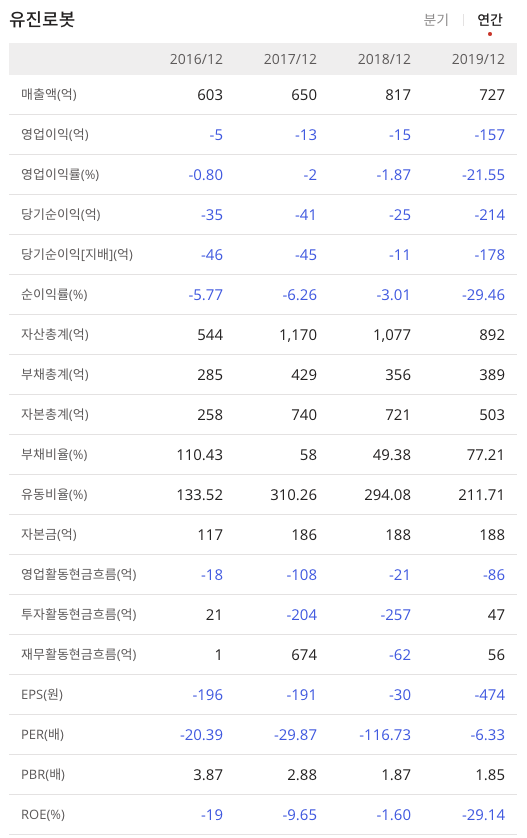 유진로봇(056080)의 연간매출액은 하락하며 순이익은 적자인 상태입니다.