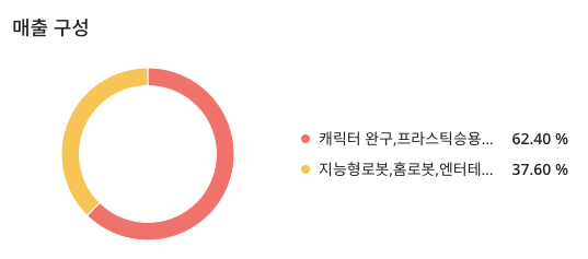 유진로봇(056080)의 매출 구성은 캐릭터 완구,플라스틱승용물,팬시용품 등 : 62.40%, 지능형로봇,홈로봇,엔터테인먼트 로봇 : 37.60% 로 구성하고 있습니다.