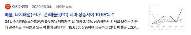 2020년 6월 4일 아시아경제 베셀, 터치패널(스마트폰/태블릿PC) 테마 상승세에 19.65%상승 이라는 기사제목을 볼 수 있습니다.