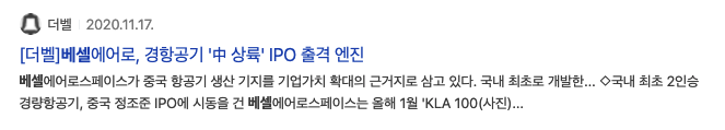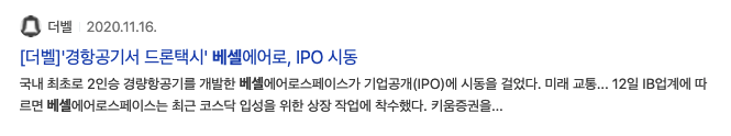 2020년 11월 16일과 17일 더벨 경항공기서 드론택시 베셀에어로 IPO 관련 기사제목을 볼 수 있습니다. 차트도 같이 준비했습니다.