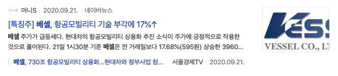2020년 9월 21일 베셀, 항공모빌리티 기술 부각에 상승 기사제목을 볼 수 있으며
