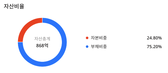 베셀(177350)의 자산총계는 868억이며 자본비중 : 24.80%, 부채비중 : 75.20%로 구성되어 있습니다.