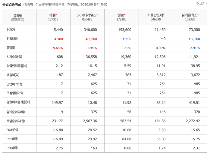 베셀(177350)의 동일업종비교 WICS분류를 기준으로 디스플레이장비부품의 동종업계는 SK머티리얼즈, 천보, 서울반도체, 실리콘윅스가 있습니다.