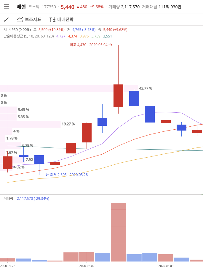 베셀(177350)도 COVID-19 52주 저점 2020년 3월 23일 1,325원을 찍고 2021년 1월 25일 52주 고점 5,500원을 찍었습니다.