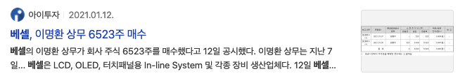 2021년 1월 12일 아이투자 베셀, 이명환 상무 6,523주 매수 기사제목을 볼 수 있습니다.
