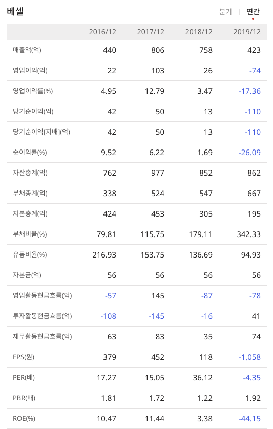 베셀(177350)의 매출액과 영업이익 그리고 순이익률을 자세하게 확인을 해보면 2019년 적자인것을 확인 할 수 있습니다.