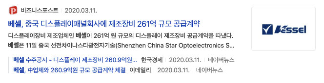기존 사업관련 내용은 2020년 3월 11일 비즈니스포스트 베셀, 중국 디스플레이패널회사에 제조장비 261억 규모 공급계약 이라는 기사제목을 볼 수 있습니다. 중국 선전차이나스타광전자기술이 보입니다.