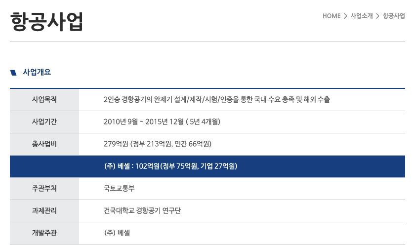 베셀(177350)의 항공사업도 진행했으며 2인승 경항공기의 완제기 설계/제작/시험/인증을 통한 국내 수요 충족 및 해외 수출을 목적으로 사업을 진행했다고 소개가 되어 있습니다. 사업기간은 2010년 9월 ~ 2015년 12월 대략 5년 입니다.