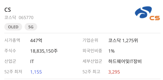 CS(065770)는 OLED와 5G로 분류가 되어 있는데 아래에 기업정보를 확인하면서 이유를 준비했습니다.