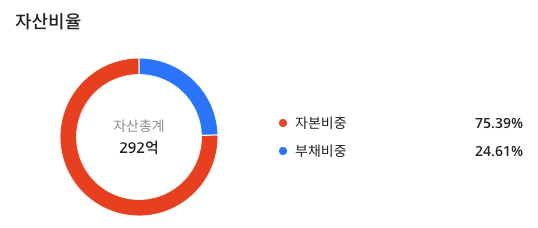CS(065770)의 자신비율을 확인해보면 자산총계 292억이며 자본비중 : 75.39%, 부채비중 : 24.61%로 구성되어 있습니다.