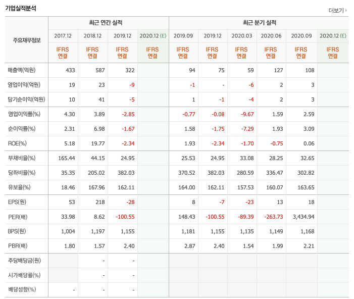 EPS : 1 , BPS : 1,168 , PER : 3,575.00, 업종PER : N/A , PBR : 2.30 , 현금배당수익률은 없습니다.