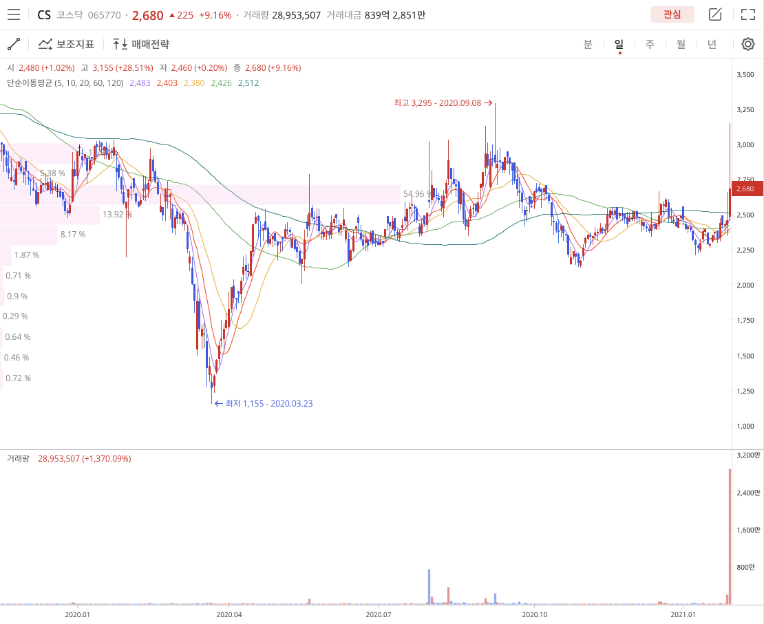 CS(065770)는 COVID-19 52주 저점 2020년 3월 23일 1,155원을 찍고 52주 고점 2020년 9월 8일 3,295원을 찍고 2021년 1월 29일 2,680원에 종가로 2021년 1월달은 마감을 했습니다.