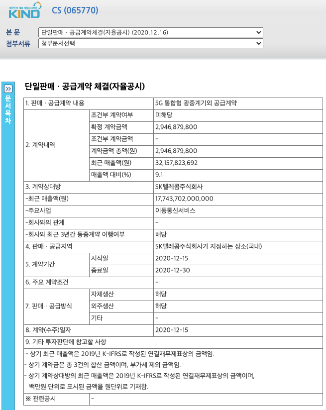 여기까지 준비한 CS(065770)종목정보 5G장비종목 SK텔레콤납품종목 중계기종목 통신종목관련 내용이였습니다. 다른종목에서 만나요.
