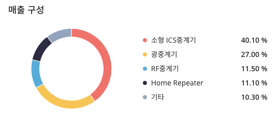 CS(065770)의 매출구성은 소형 ICS중계기 : 40.10%, 광중계기 : 27.00%, RF중계기 : 11.50%, Home Repeater : 11.10%, 기타 : 10.30%로 구성되어 있습니다.