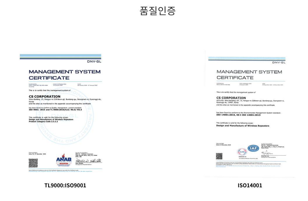 품질인증은 TL9000:ISO9001, ISO14001이 인증이 되어 있습니다.