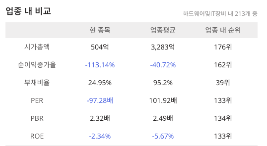 CS(065770)의 세부산업군 기준으로 하드웨어및IT장비 내 213개 중 업종 내 시가총액 176위(447억)입니다.