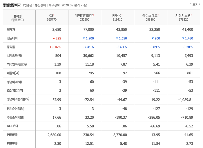 CS(065770)는 코스닥 : 통신장비, WICS : 통신장비, 산업군 : IT, 세부산업군 : 하드웨어및IT장비로 분류가 되어 있으며