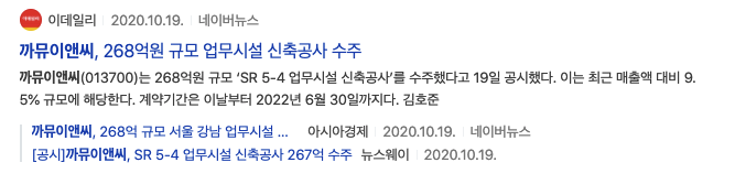 2020년 12월 10일 아이투자 까뮤이앤씨, 431억 규모 화성 아파트 공사 계약 체결 내용과 2020년 10월 19일 이데일리 까뮤이앤씨, 268억원 규모 업무시설 신축공사 수주 기사제목을 볼 수 있습니다.