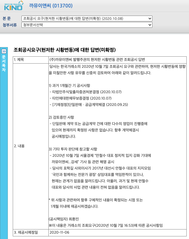 2021년 1월 28일 머니투데이 야권 단일화 이슈에 안랩, 까뮤이앤씨 안철수 테마주 출렁이라는 기사제목을 볼 수 있으며 2020년 10월 8일 공시를 보면 현재는 관계가 없음을 알려드린다는 내용을 볼 수 있는데 그래도 안철수 테마주로 보는듯 합니다.