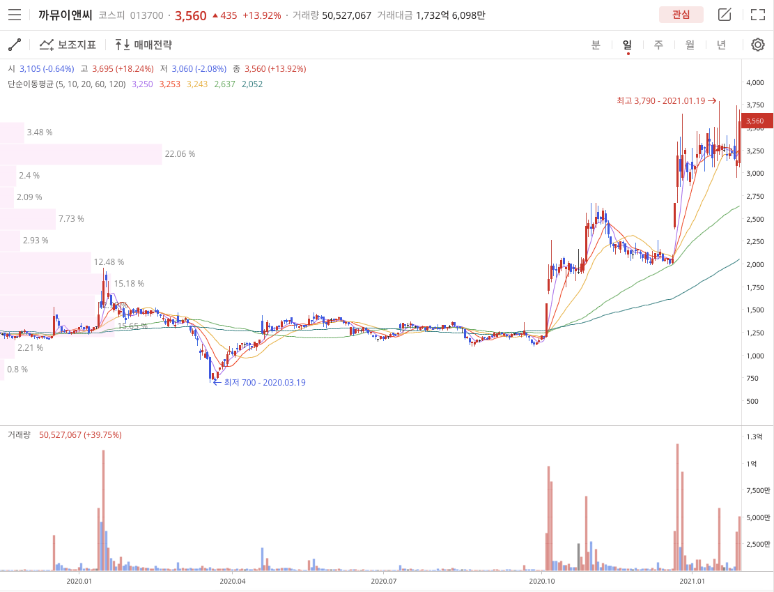 까뮤이앤씨(013700)는 2020년 3월 19일 COVID-19 52주 저점 700원을 찍고 2021년 1월 19일 52주 고점 3,790원을 찍고 2021년 1월 29일 3,560원에 종가로 1월달 을마감했습니다. 52주 고점을 시원하게 뚤어주면 좋겠습니다.