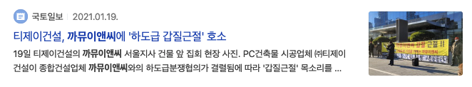 2021년 1월 19일 국토일보 티제이건설, 까뮤이앤씨에 하도급 갑질근절 호소 라는 기사제목을 볼 수 있습니다.