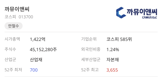 이번시간은 까뮤이앤씨(013700)종목에 대해서 알아보는 시간입니다 지속적으로 한번씩 거래량이 올라왔기 때문에 어떤 기업인지 알아보는 시간입니다. 여러 사이트에서 나온 같은 내용을 전부 가져와서 보는 시간이기 때문에 비교를 하기 좋다고 생각을 합니다.