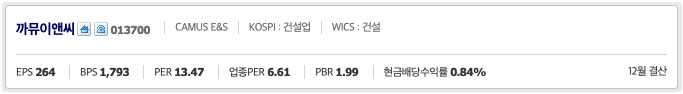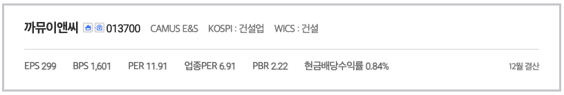 까뮤이앤씨(013700)는 토목공사 등의 종합건설업과 PC 제품의 제조 및 판매업, 부동산임대업을 주요사업으로 영위하고 있으며 PC공법을 이용한 국내외 대형 건축물의 외관공사, 조립식 아파트 건설 및 공장건설 등을 수행하여 공기단축과 우수한 시공능력을 인정 받고 있음. 2019년 기준 시공능력평가 158위를 기록했습니다.