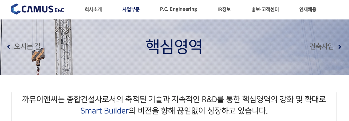 까뮤이앤씨(013700)는 사업부문은 건축 , 주택 , 토목 , PC로 나눠지고 있습니다.