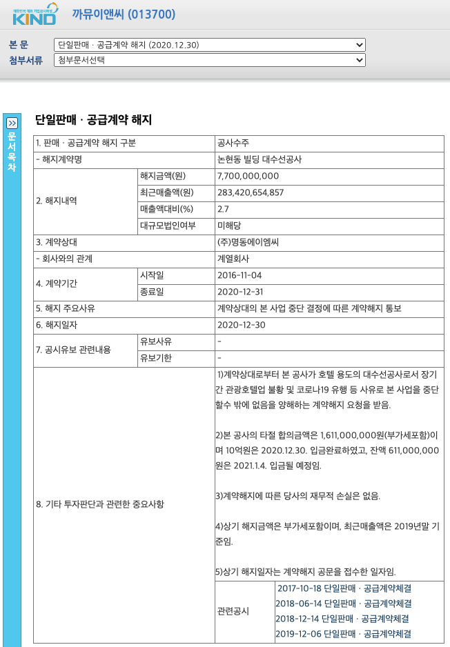 까뮤이앤씨(013700)의 2020년 12월 30일 공시가 있으며 공사 수주 사업 중단 결정에 따른 계약해지 통보 공시가 있습니다.