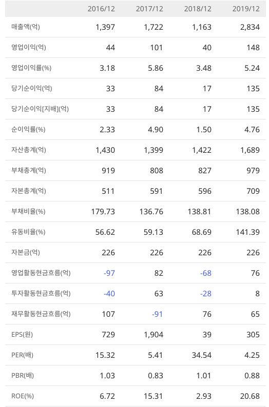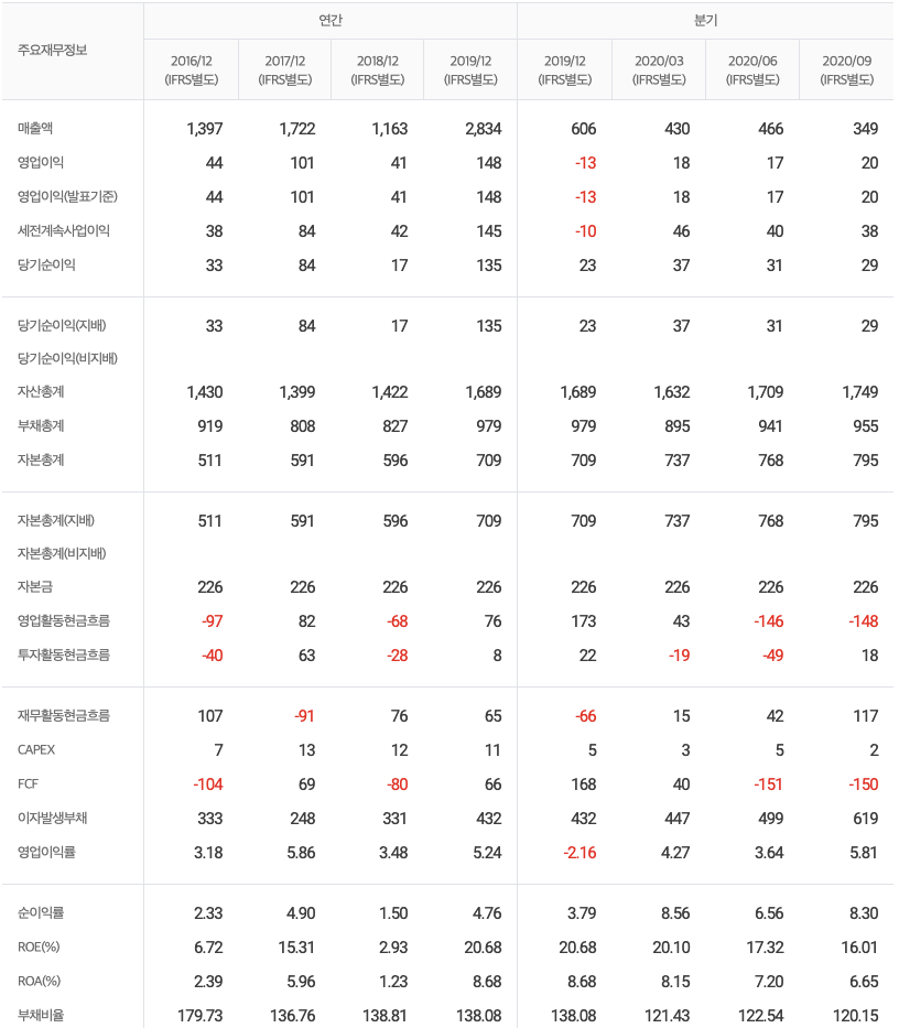 2020년 9월 전년동기 대비 별도기준 매출액은 44.1% 감소, 영업이익은 63.8% 감소, 당기순이익은 13.9% 감소. 전분기 대비 매출액을 감소하였고, 전년동기 대비 여전히 누적 매출액은 낮음. 이로 인한 영업이익과 당기순이익 감소. PC공사 기술력을 바탕으로 한 대형 PC공사의 성공적 수행, 초역세권 중심의 건설사업 수행 등 호실적으로 유동비율이 크게 개선되었으며 부채비율은 업종 평균을 하회하고 있음.