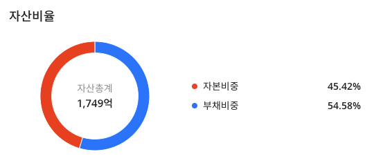 까뮤이앤씨(013700)의 자산비율을 보면 자산총계 : 1,749억 , 자본비중 : 45.42% , 부채비중 : 54.58% 이며