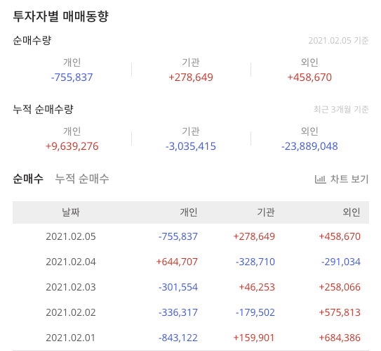 BNK금융지주(138930)의 최근 3개월 기준 투자자별 매매동향을 보면 누적 순매수량은 개인이 매수를 했으며 기관과 외인은 매도를 했습니다.