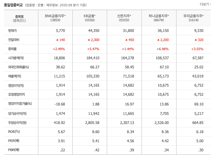 BNK금융지주(138930)의 동일업종비교로는 KB금융 , 신한지주 , 하나금융지주 , 우리금융지주가 보입니다.