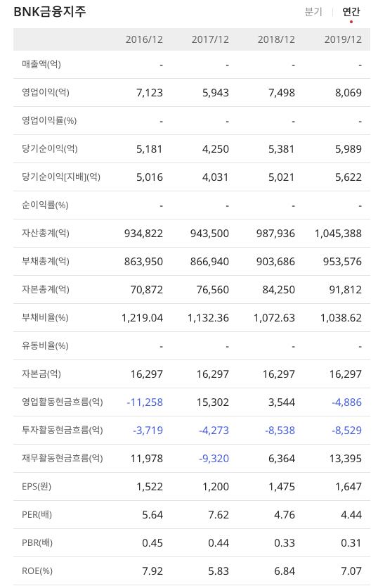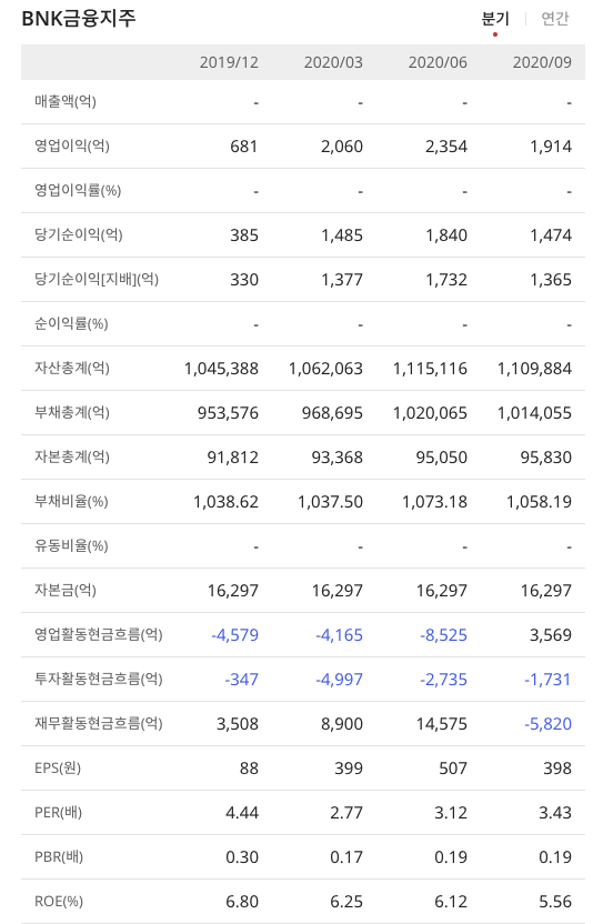 BNK금융지주(138930)의 분기와 연간 매출액을 확인을 해보겠습니다.