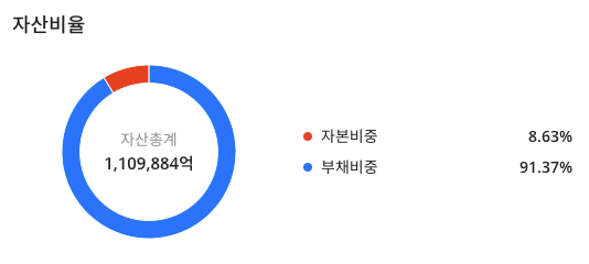 BNK금융지주(138930)의 자산총계는 1,109,884억이며 자본 비중 : 8.63%, 부채비중 : 91.37%, 으로 구성이 되어 있으며
