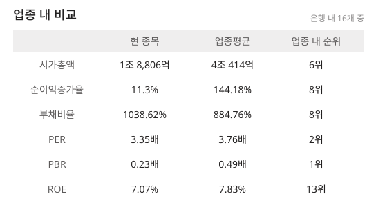 세부산업군 기준으로 은행 내 16개 중 업종 내 시가총액 순위 6위(1조 8,806억) PBR : 1위 , PER : 2위 , ROE : 13위 입니다.