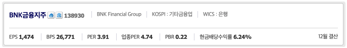 코스피 : 기타금융업 , WICS : 은행 , EPS : 1,474 , BPS : 26,771 , PER : 3.91 , 업종PER : 4.74 , PBR : 0.22 , 현금배당수익률 : 6.24%