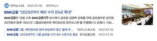 2021년 1월 19일 아이뉴스24 BNK금융 "2023년까지 해외 수익 5%로 확대"라는 기사제목을 볼 수 있습니다. 관련 뉴스 한국금융신문의 제목을 보면 2023년까지 그룹 글로벌 수익 5% 수준으로 향상이라는 기사제목을 볼 수 있습니다.