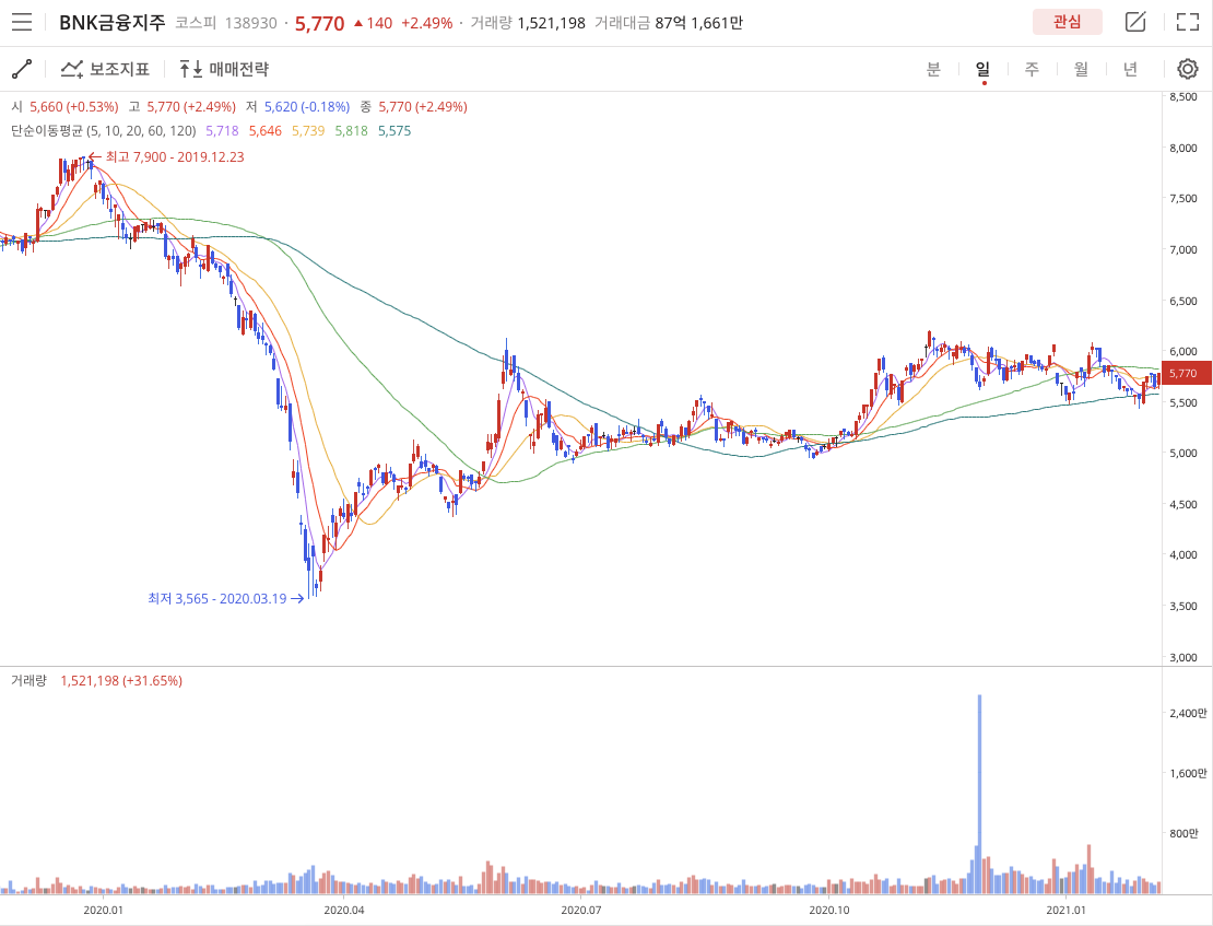 BNK금융지주(138930)는 2020년 3월 19일 COVID-19 52주 저점 3,565원을 찍고 2021년 2월 5일 종가 5,770원이며 52주 고점이 있으나 COVID-19 이전 가격위로 못 올라왔기 때문에 개인적으로 생각을 할때 2020년 11월 11일 6,200원이라고 생각을 하고 있습니다.